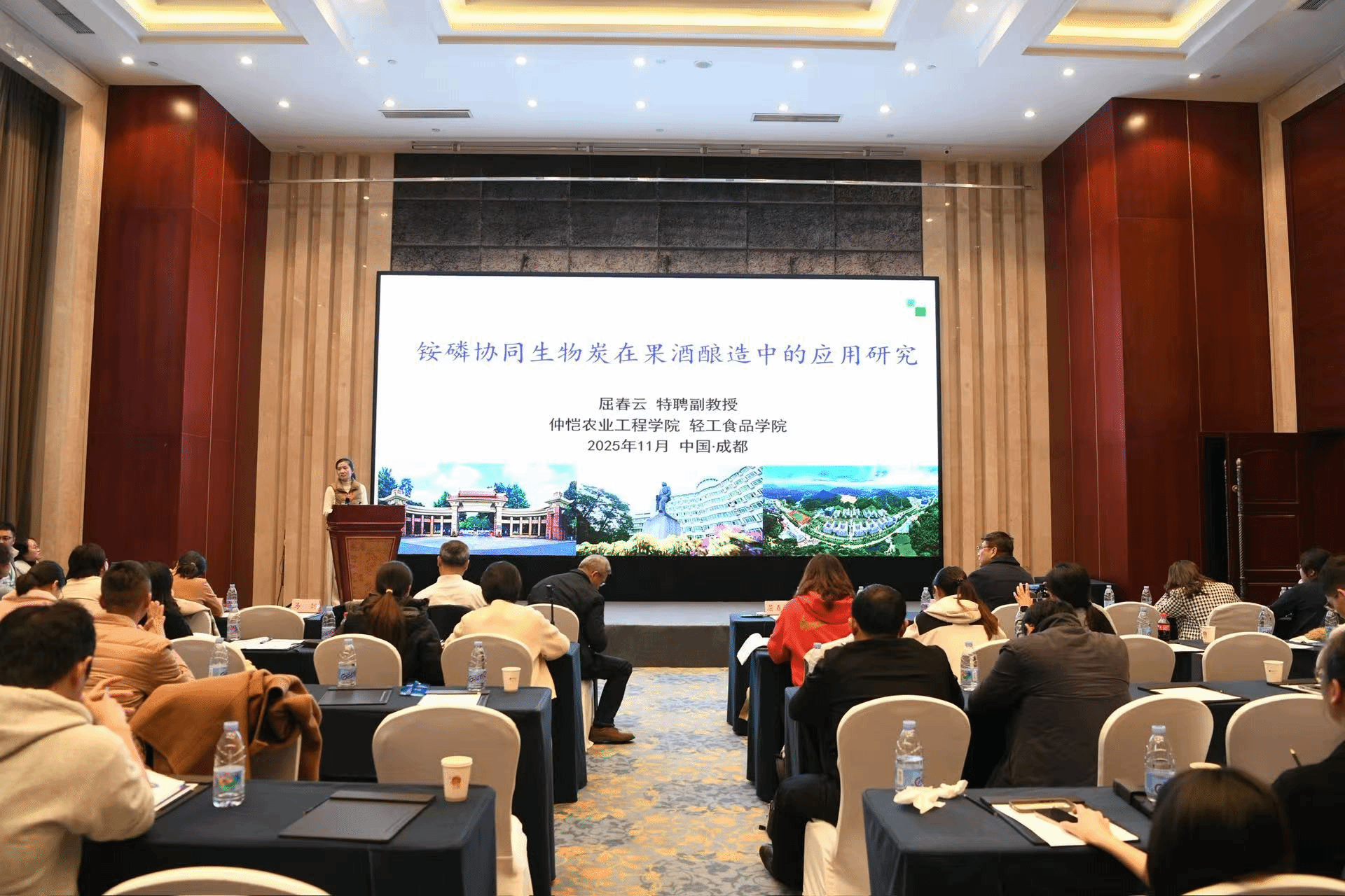 大会设两个平行分会场。会场一以“酿造食品微生态与风味”为主题,聚焦功能微生物、发酵风味形成机制等前沿方向;会场二围绕“酿造机理解析与现代化酿造”,探讨酿造过程调控、装备升级与工艺创新等关键问题。公司屈春云博士在分会场二作了题为“铵磷协同生物炭在果酒酿造中的应用研究”的专题报告,分享了食品生物制造创新团队近年来在岭南特色果酒品质提升方面的研究成果,内容涵盖果酒酿造菌株的挖掘、酯类物质提升策略,以及通过发酵调控降低果酒中高级醇含量的机制解析与实际应用。屈春云博士还在会上介绍了公司的办学历史与伟德betvlctor1949源于英国的主要科研成就。