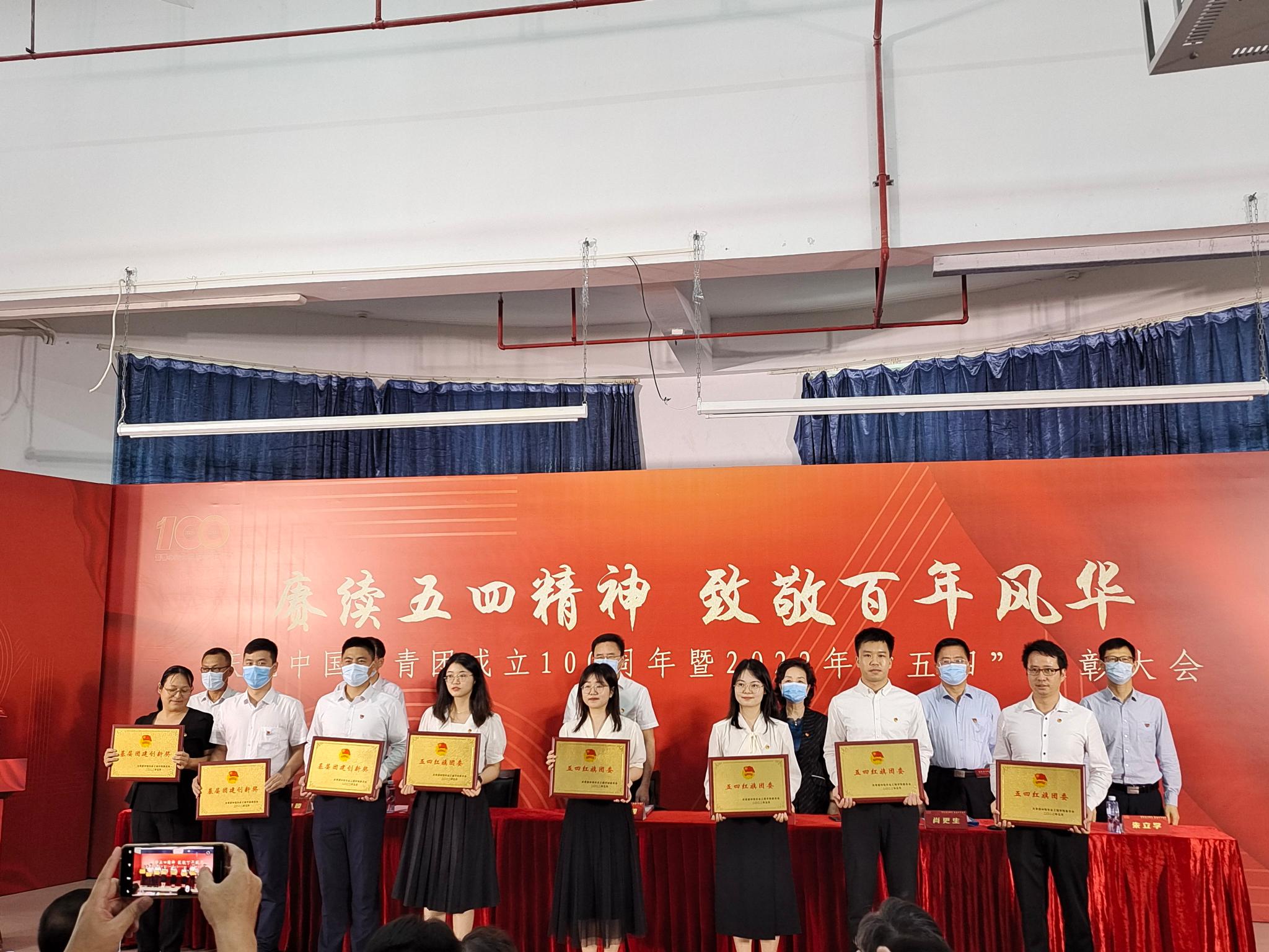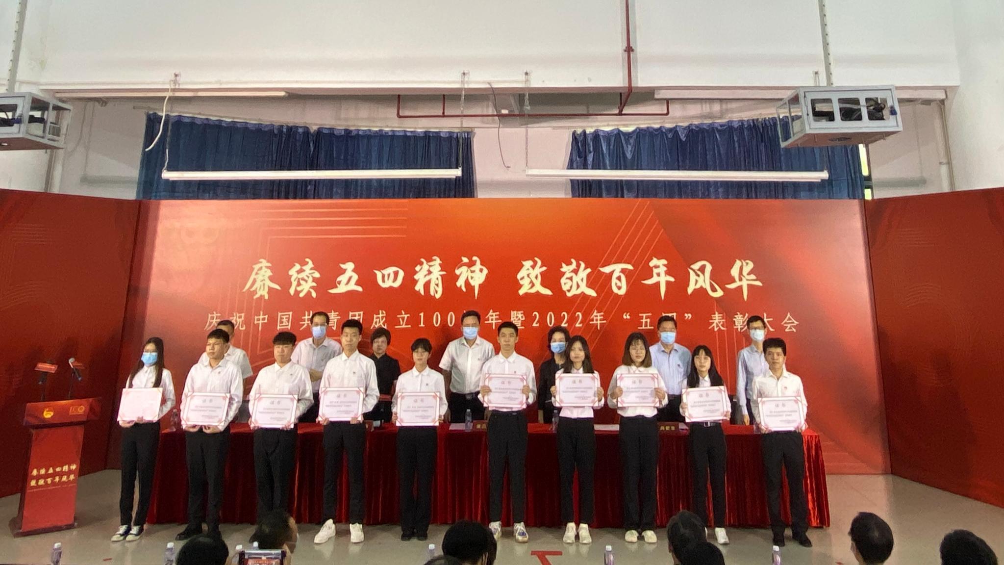 56日下午,公司在白云校区D1小礼堂隆重举行纪念共青团成立100周年暨五四表彰大会对获得2021-2022年度五四先进集体和优秀个人进行表彰,公司师生获得多项荣誉。其中,刘袆帆老师荣获“仲恺青年五四奖章”,食品191班团支部获得“五四红旗团支部”荣誉称号,食品181班姚宛君等8位同学获得“优秀共青团干部”荣誉称号,食品181班朱君燕等35位同学获得“优秀共青团员”荣誉称号,食品192班岑欣和陈希同学荣获“疫情防控优秀志愿者标兵”荣誉称号,公司团委荣获“基层团建创新奖”。