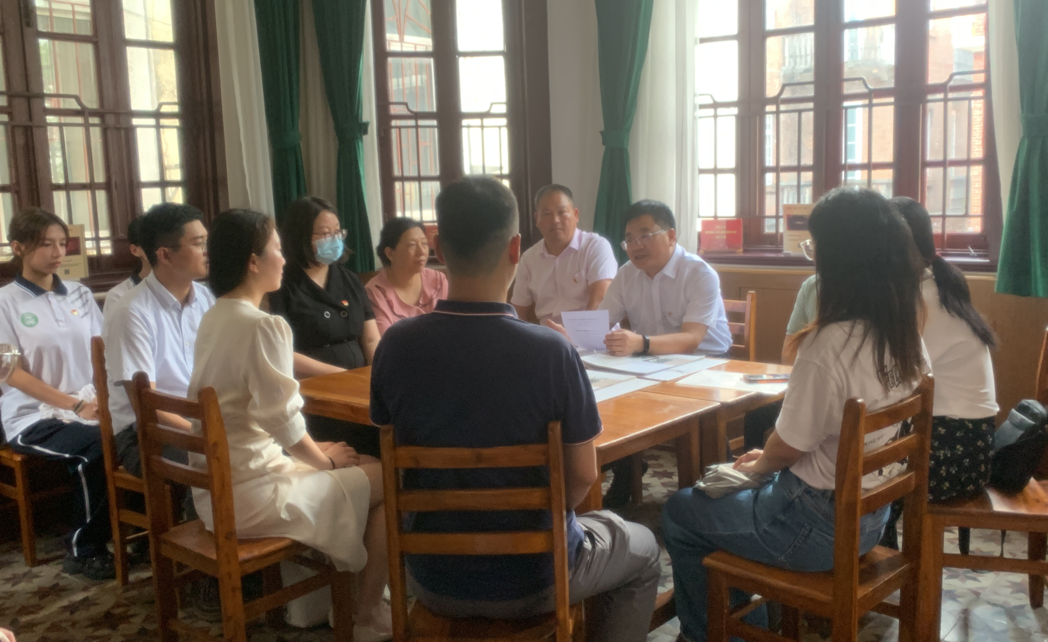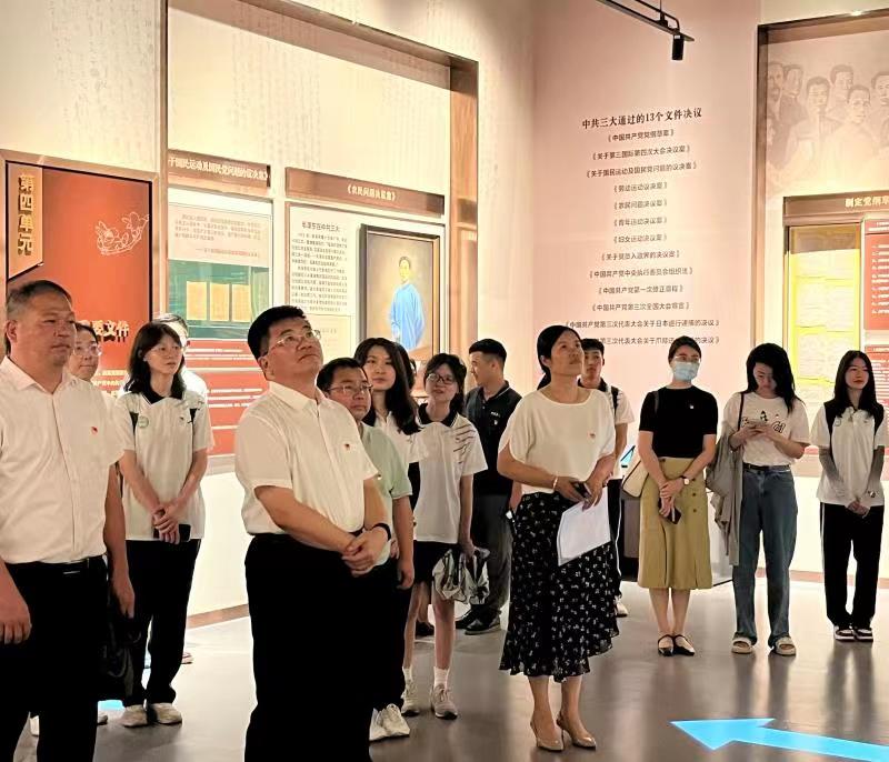 肖更生与党员们一起参观中共三大会址纪念馆与春园,从“上下求索—中共三大召开的历史背景”“凝聚共识—中共三大的召开”“风起云涌—轰轰烈烈的大革命”“理想之光—新中国成立前牺牲的中共三大代表”四个方面详细了解中共三大召开的历史背景、会议过程、会议成果及深远影响。师生党员通过现场聆听讲解、观看全息影像的形式,深刻感悟了革命信仰的力量和共产党人的责任与担当。
