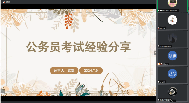朋辈的力量,是最坚强的信念;成功的经验,是最温暖的领航。此次分享会精准帮助有考公意愿的同学了解公务员报考注意事项和备考学习方法,引导同学们提早明确目标,做好备考工作。未来,公司将会继续高度重视员工生涯规划和就业指导工作,立足专业特色,聚焦就业资源,拓展就业思路,用心用情做好就业指导帮扶工作,采取多项举措为就业工作提质增效。