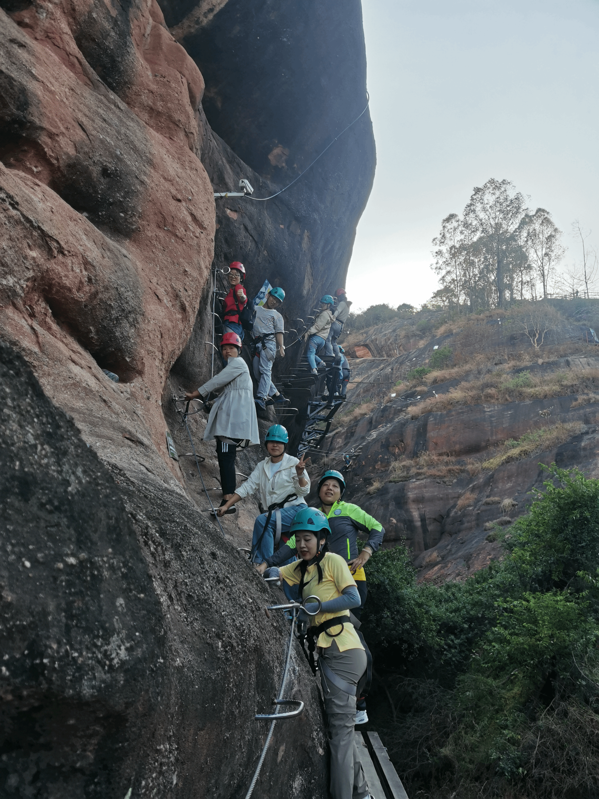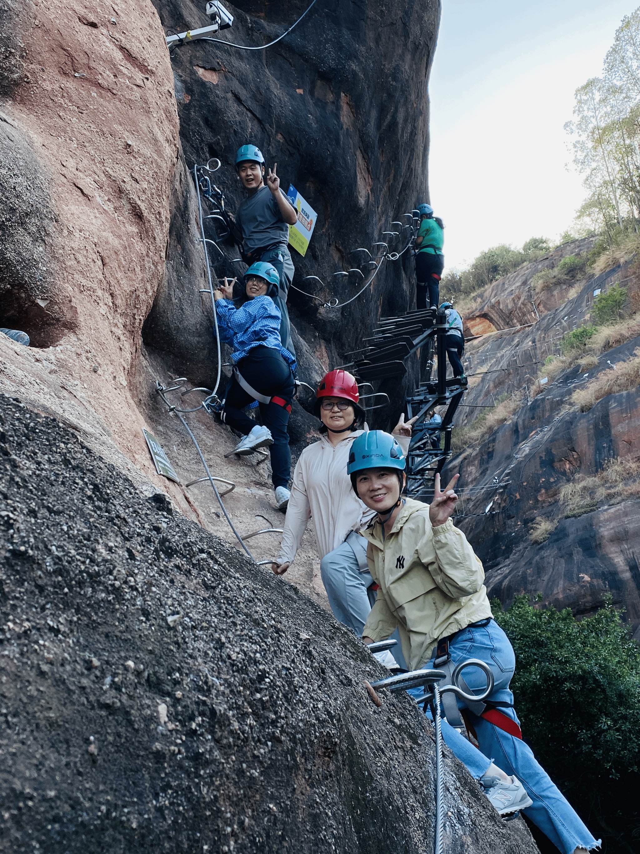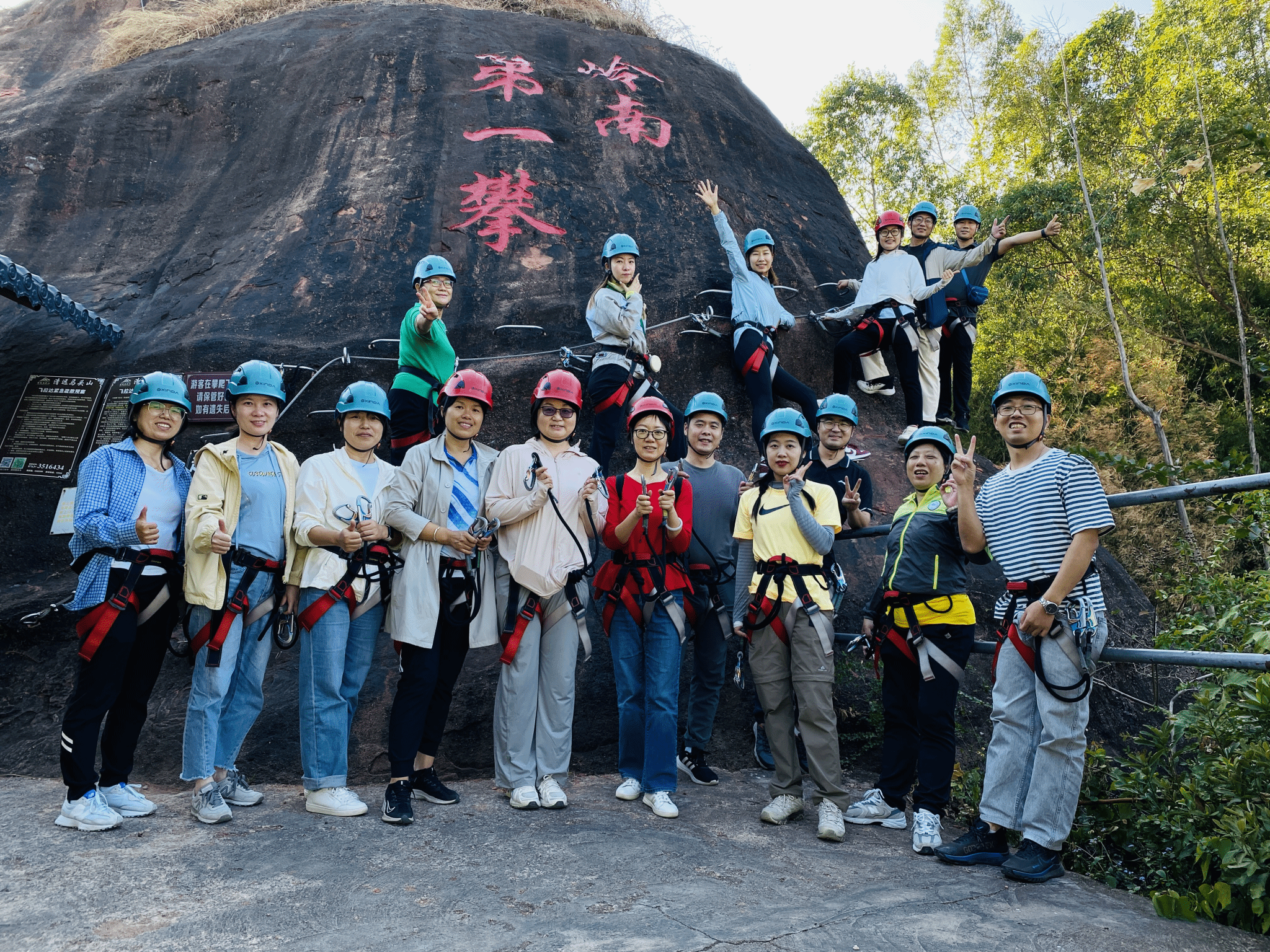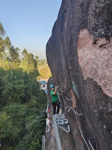 下午来到清远马头山。马头山以其险峻的山峰和独特的自然景观而闻名,是攀岩爱好者的天堂。飞拉达(Via Ferrata)是一种在岩壁上安装铁索、梯子和桥梁等辅助设施的攀岩方式,让攀岩者即使没有专业技能也能体验到攀登的乐趣。飞拉达的铁索和桥梁在险峻的岩壁上蜿蜒,公司教师开始了攀岩之旅,他们克服恐惧,勇往直前,一步步向上攀登,体验了前所未有的刺激与挑战。经过数小时的努力,大家全部成功登顶。这次攀岩不仅考验了大家的体力和耐力,更锻炼了他们的意志力和团队协作能力。