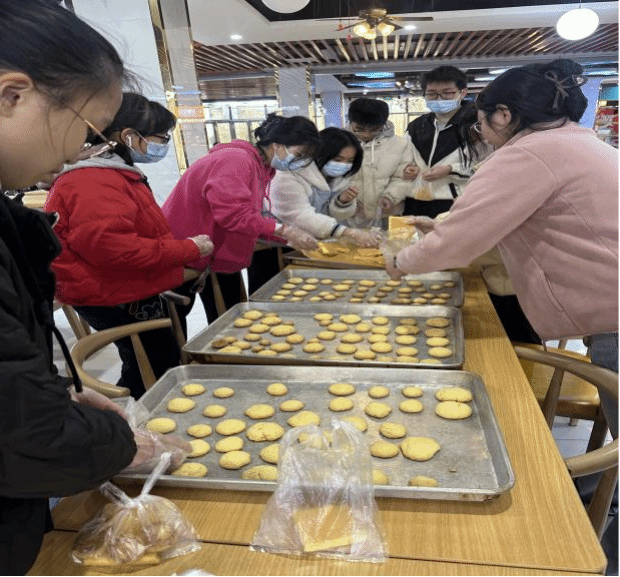 活动过程中,志愿者们准时到达活动现场,分成小组开始制作蛋糕和曲奇,他们按照配方准确称量食材,先将面粉、鸡蛋、糖等混合搅拌,然后加入适量的水和黄油,揉成光滑的面团。随后将做好的面团放入烤箱中烤制,随着烤箱温度的升高,蛋糕逐渐散发出诱人的香气。他们将课堂知识转化为指尖的魔法,将面粉变成了香气扑鼻的点心。