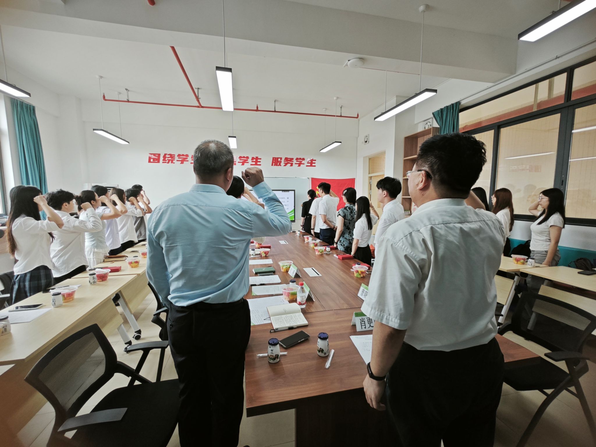 在支部书记的带领下,全体毕业生党员庄严举起右手,重温入党誓词。铿锵有力的誓言在会议室回荡,彰显了青年党员为党和人民事业接续奋斗的坚定信念。