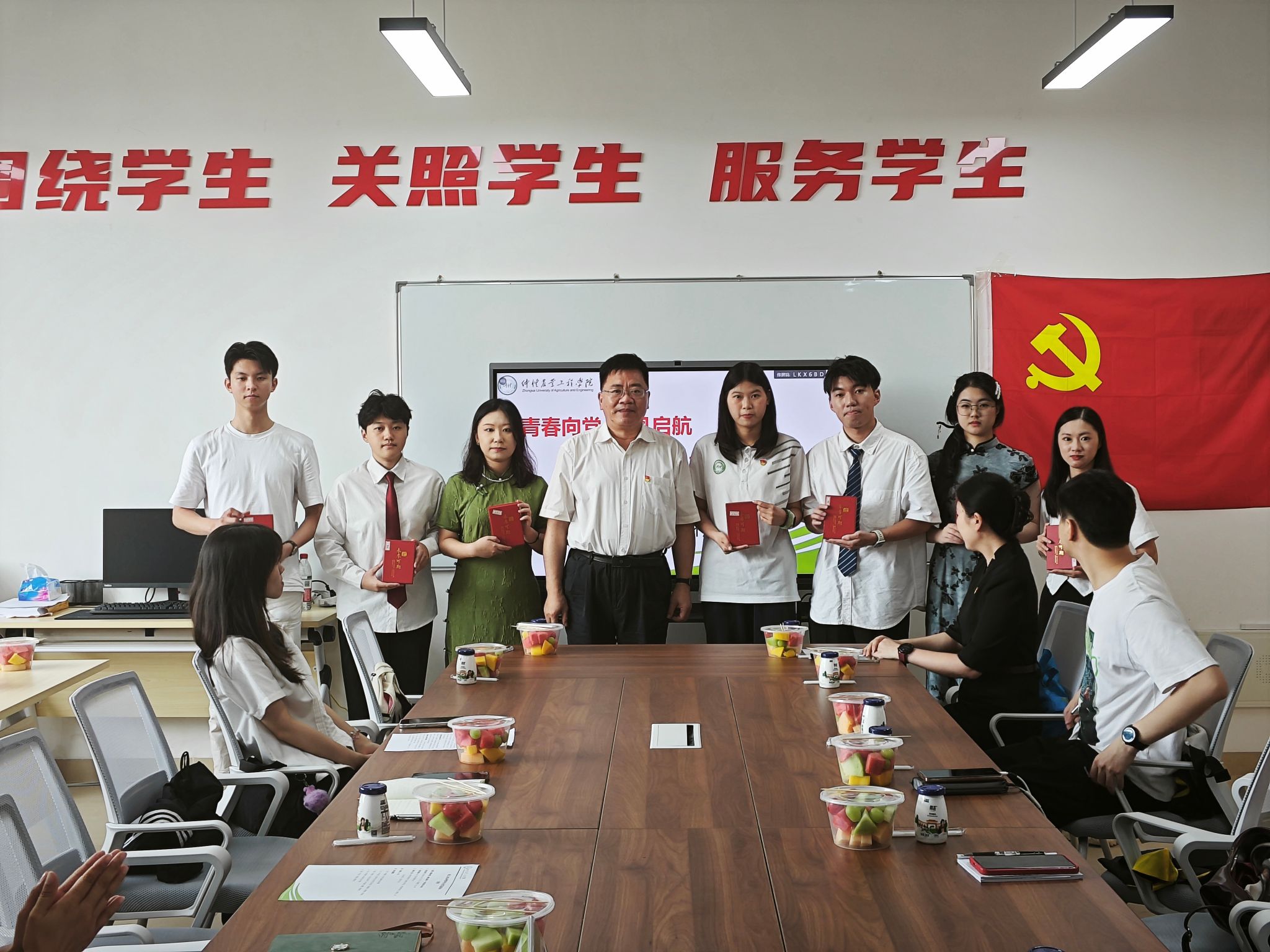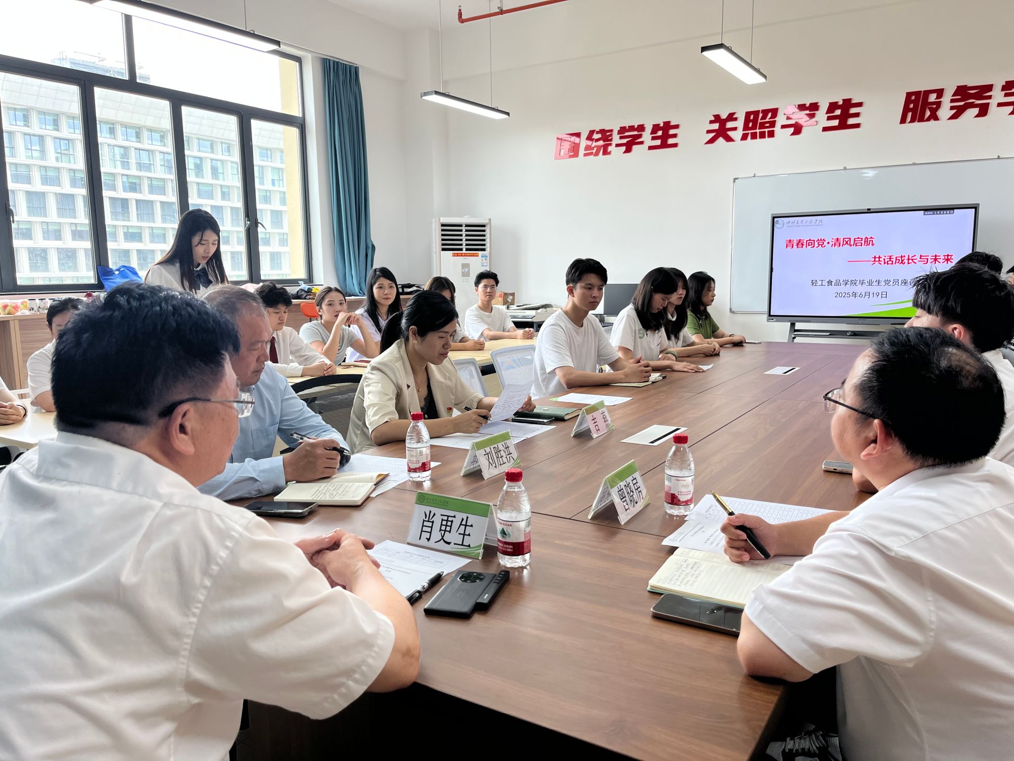 座谈会现场举行了温馨的毕业礼物发放仪式,肖更生为毕业生党员代表赠送了包含党章、党史书籍和定制纪念品的礼盒,寓意“传承红色基因,永葆食品人本色”。