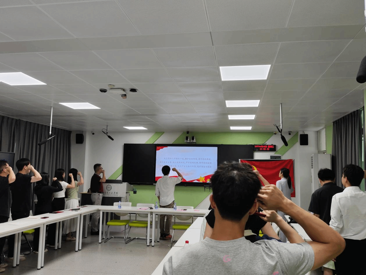 最后,张旭带领全体党员集体宣誓,重温入党誓词。一字一句铿锵有力的誓言回荡在会议室,激励着毕业生党员们在新的征程中继续发挥党员的先锋模范作用。