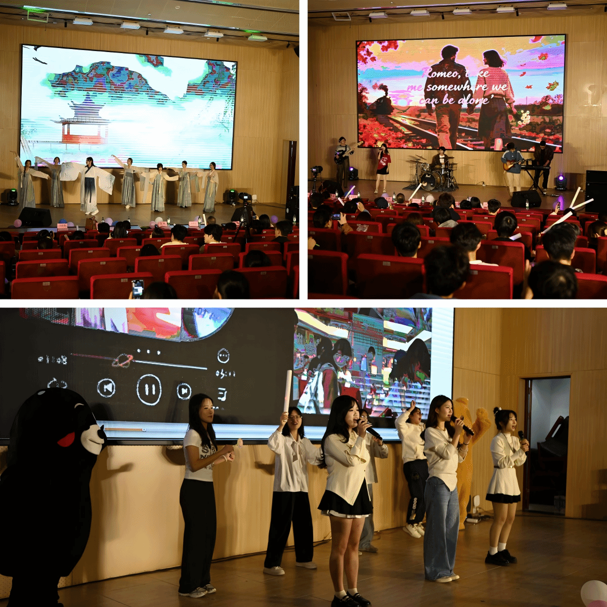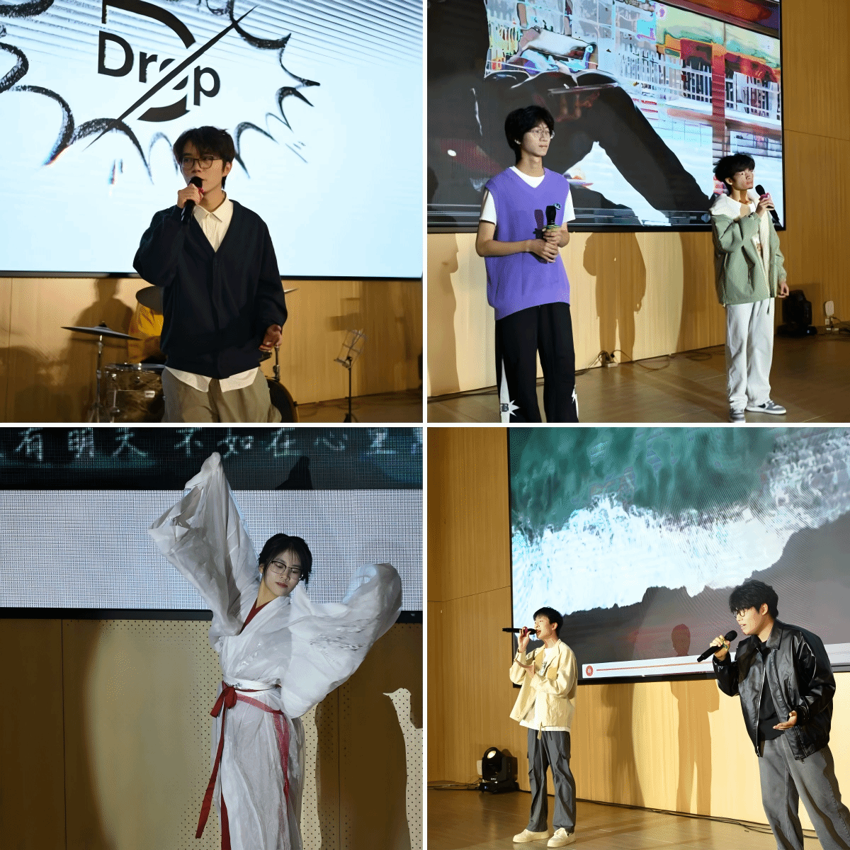 顽石音乐协会乐队以一曲《小小虫》引爆舞台,激昂的摇滚节奏诠释了青春的热烈与不羁;公司25级新生于昊然、利铭昱对唱《修炼爱情》情感细腻,唱出成长中的百味交织;现代舞《字和句关于你》则以极具张力的肢体语言,讲述青春故事里的复杂心绪。伴随着公司24级蔡浩渝、林梓烁献唱《我们的明天》,温暖歌声满载对未来的期盼,将现场氛围推向高潮。