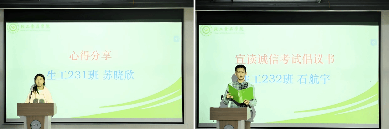 在交流分享环节,生工231班苏晓欣同学结合自身参与学科竞赛、科研训练与学风建设活动的经历,分享了关于高效学习、时间管理与综合素质提升的心得体会。随后,生工232班石航宇同学代表公司员工会,面向全体同学庄严宣读了《诚信考试倡议书》,号召大家端正考风考纪,以真才实学接受检验,共同守护公平公正的考试环境,将诚信品格践行于求学始终。
