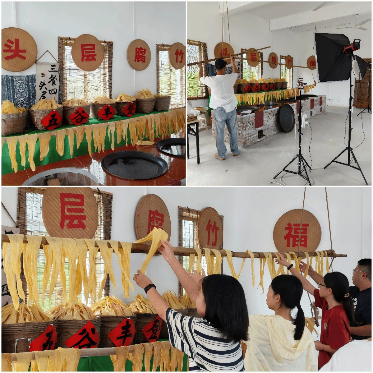 突击队成员们以“助力产业升级、讲好产业故事”为目标,迅速投身实践,在腐竹销售直播间,队员们化身为“食品加工工艺传播者”,细致讲解着腐竹加工工程中黄豆挑选、浸泡、磨浆煮浆、挑膜、晾晒、晾晒环境调控、保存条件等一道道繁琐而精细的工序。随后,队员们深入生产一线,跟随熟练的工人师傅们练习腐竹起皮时机和掌握悬挂晾晒手法,在实践中触摸传统工艺。队员们以实际行动践行“百千万工程”激活乡村发展动能的使命,让青春力量深度融入乡村产业振兴脉络。