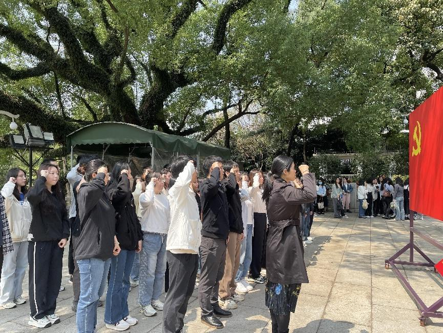 献花后,吉燕带领全体党员在鲜红的党旗前重温了入党誓词,字字铿锵,初心不改,激人奋进。在讲解员的带领下全体党员环绕纪念碑一周,瞻仰了碑身浮雕刻画的那段历史,感悟了广州起义中诸位先烈们的壮志。