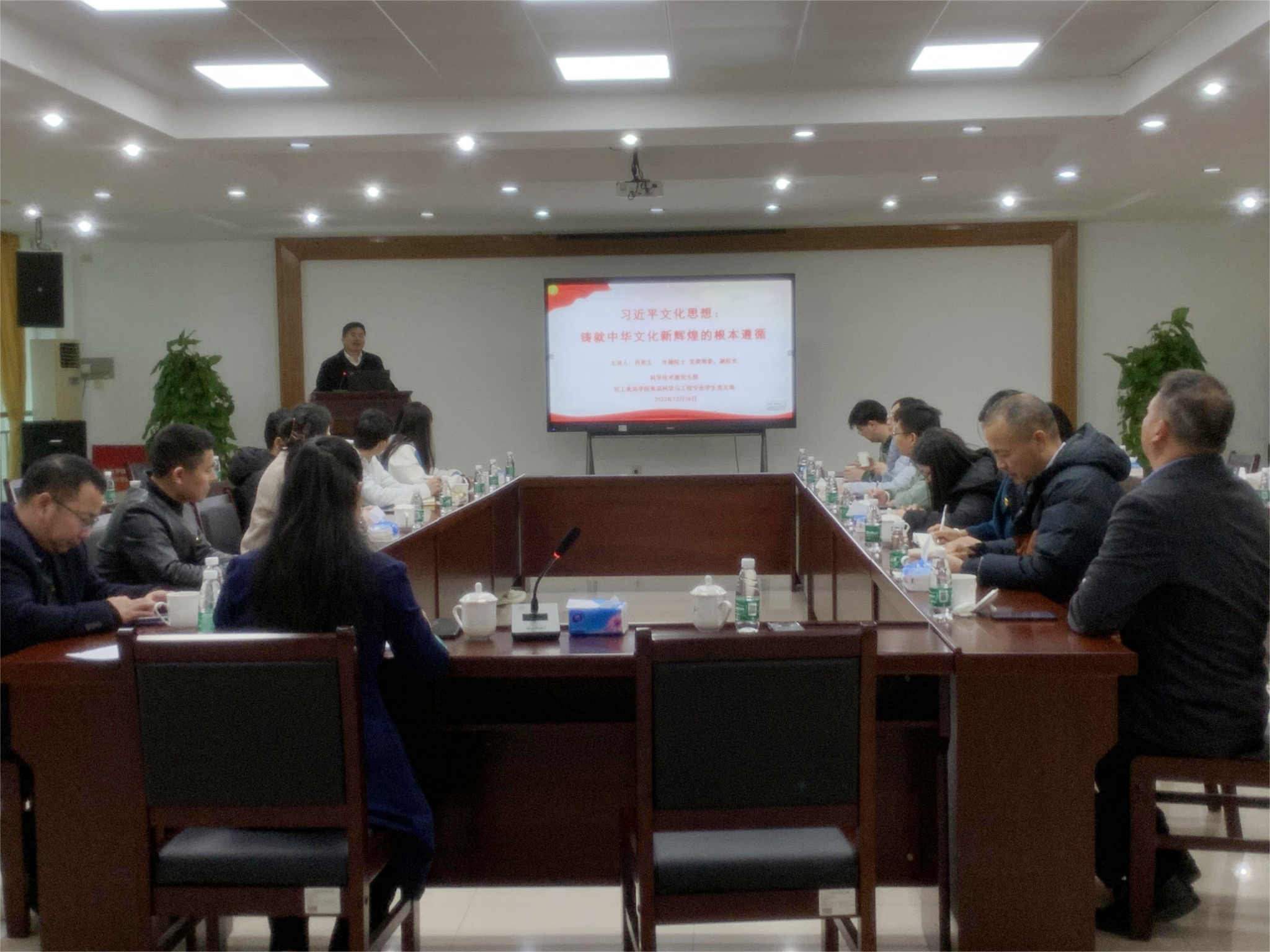 肖更生带领支部成员深入学习贯彻习近平文化思想。肖更生结合工作与生活体会从习近平文化思想彰显着“培根铸魂”的磅礴文化力量、彰显着“赓续文脉”的坚定文化自信、彰显着“明体达用”的高度文化自觉、彰显着“强国复兴”的强烈文化担当四点,深刻解释与阐述了习近平文化思想的意义与内涵。肖更生指出,两个支部要充分利用“结对共建”交流平台,将党建工作与教学、科研、管理、服务有效结合,创新基层党建工作方式方法,主动服务师生,主动服务教学科研工作,主动服务公司发展,切实发挥好党支部的战斗堡垒作用和党员的先锋模范作用。